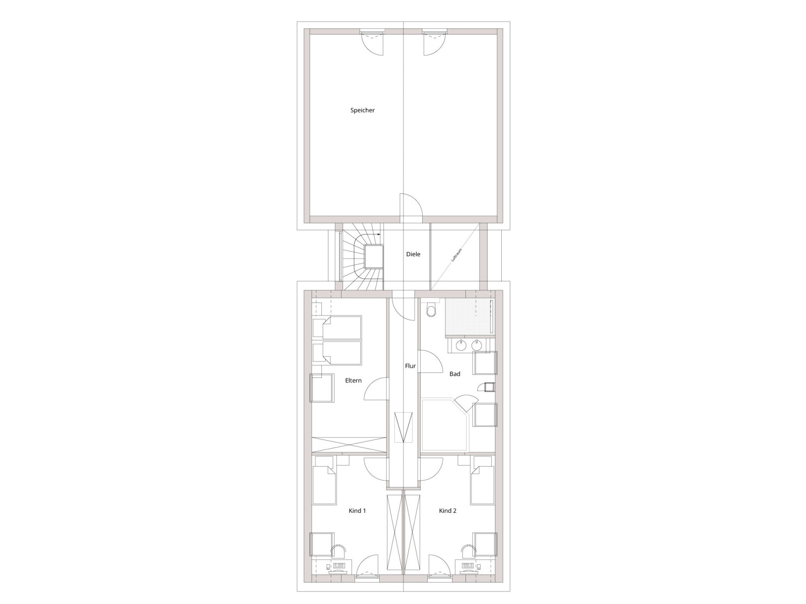 | Dachgeschoss: 83m² | Eltern 19m², Kind1 16m², Kind2 16m², Bad 18m², Flur 9m², Diele 5m² |