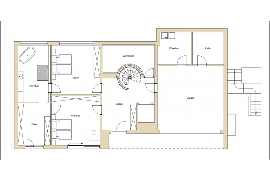 Wohnen 23m², Eltern 23m², Büro 13m², Entree 22m², Elternbad 17m², Weinkeller 12m², Waschen 10m², Keller 10m² |