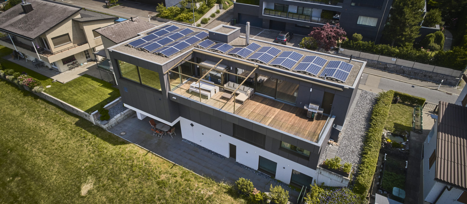 Zurück im Entrée hat die Familie die Wahl: Nimmt sie die stylische Wendeltreppe ins Dachgeschoss – oder doch den Fahrstuhl, der sich ganz unauffällig hinter der Garderobe versteckt? Oben angekommen, eröffnet sich in jedem Fall ein mit 90 Quadratmetern riesiger Wohn-, Koch- und Essbereich, in dem zunächst der moderne, frei von der Decke hängender Kamin ins Auge fällt. Am Ende des Wohnzimmers schließt sich ein WC sowie ein weiterer Büroraum an. Bodentiefe Holz-Alu-Fenster aus Fichtenholz auf der gesamten Länge der von der Straße abgewandten Seite des Raums geben den Blick auf eine wunderschöne Seenlandschaft frei und sorgen für viel natürlichen Lichteinfall. Über eine Schiebetür erreicht man von hier aus die 54 Quadratmeter große Terrasse, die dank einer großen Markise im Sommer viel Schutz vor der Sonne bietet. Und wer lieber das Treiben auf der Straße beobachten möchte, kann es sich auf dem Balkon auf der anderen Seite des Hauses gemütlich machen.