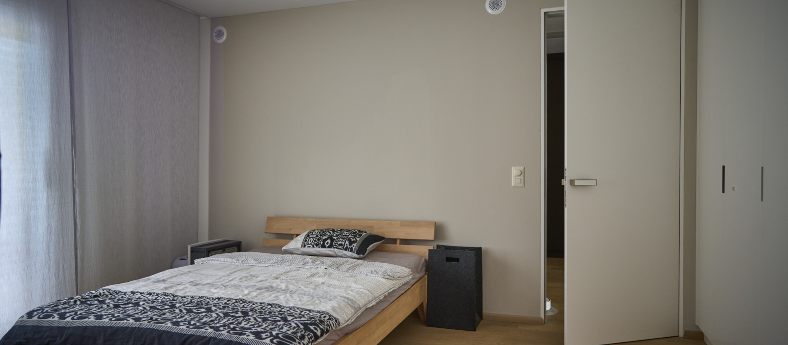 Das Ergebnis ist ein modernes, energiesparendes Holzhaus mit Flachdach, das nicht nur den hohen ökologischen Ansprüchen der Bauherren Rechnung trägt, sondern auch ästhetisch überzeugt. Von außen besticht das Gebäude direkt mit einer Verkleidung aus dunklen matten Fassadenplatten, unter der sich eine Putzfassade verbirgt. Von der Straßenseite her betritt man zunächst das Entrée mit Garderobe, von dem eine Wendeltreppe aus Eichenholz in das Obergeschoss führt. Für einen besonderen Akzent sorgen hier vertikale Leuchtstreifen, die den Vorraum je nach Stimmungslage in verschiedenen Farben erstrahlen lassen. Rechter Hand erreicht man die Garage, die zu einem Wasch- und einem Kellerraum weiterführt. Hinter der Wendeltreppe befindet sich der gut bestückte Weinkeller der Familie, während linker Hand ein Schlaf- und ein kleines Wohnzimmer anschließen. Das Elternschlafzimmer führt in ein eigenes Elternbad mit freistehender Badewanne, barrierefreier Dusche und Doppelwaschbecken, von dem aus wiederum eine Verbindung ins Bürozimmer besteht.