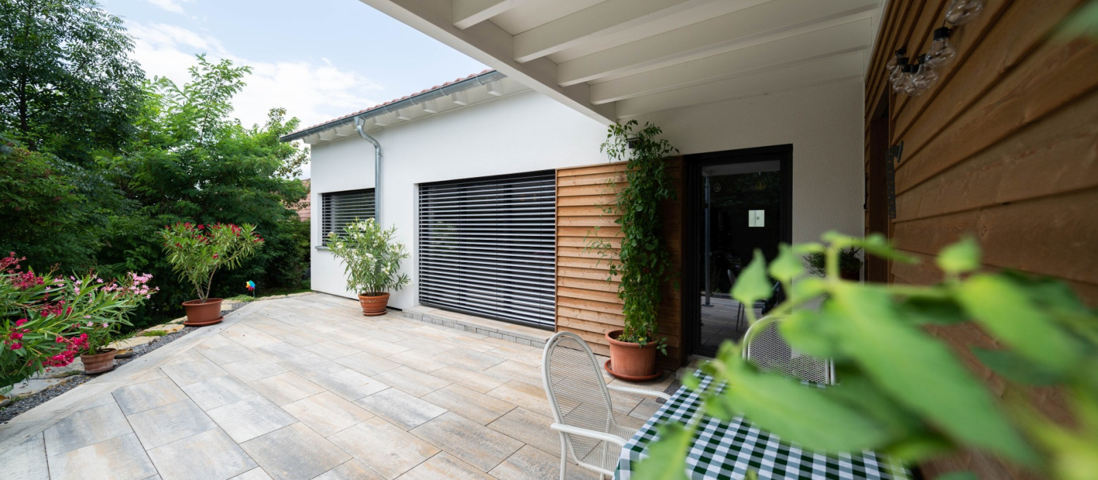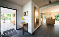 | Details/Extras | Außenwand als Ökowand mit Installationsebene, Fassade als Putzfassade mit Holzelementen in waagrechter Schalung, Pergola mit Flachdach, Verschattung mit Rollläden und Jalousien, sichtbare Brettstapeldecke |